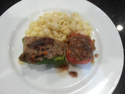 So I made stuffed peppers for dinner. The stuffings are ground beef, onion, carrot, celery, mushroom and quinoa. Yes, cleaning in the fridge. It was pretty tasty!
